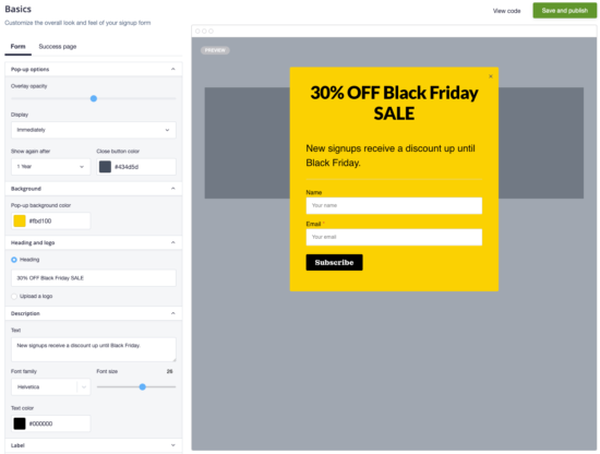 Encourage visitors to become subscribers as soon as they land on your website, or on pages of your choosing with a form designed to capture visitors’ attention and drive engagement. Easily customize your form’s appearance and set rules for when it should display using the built-in options. Once you’ve finished building your form, team up with someone with developer skills to assist in integrating it directly into your website. First, create an account and then build a pop-up form.